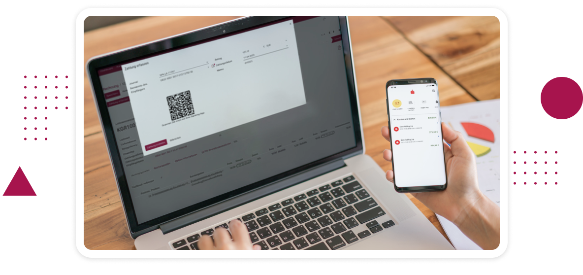 Der dabei aus der Rechnung generierte QR-Code kann nun mit ihrem Mobiltelefon eingelesen werden. Dabei werden alle relevanten Angaben automatisch übertragen und Sie können die Zahlung mit wenigen Klicks auslösen, ohne dass manuelle und somit fehleranfällige Eingaben erforderlich sind.
