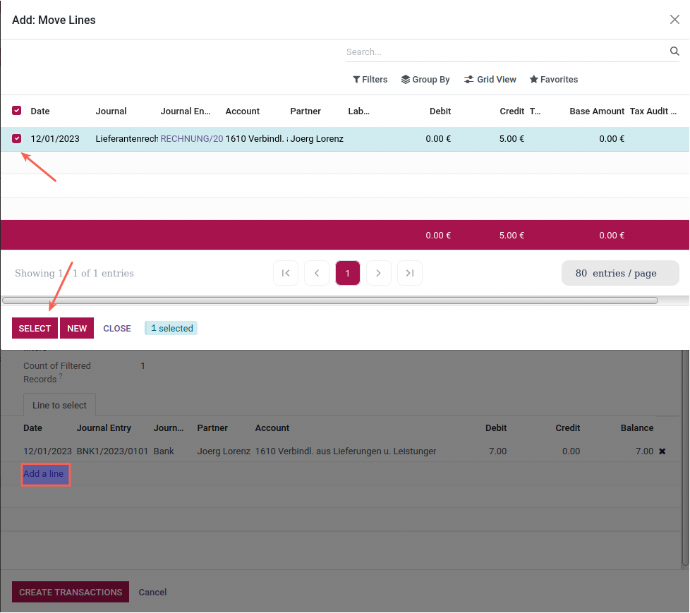 Once all relevant invoices are chosen, you click on "create transactions," thereby generating the payment order to your bank, which includes the invoices you have selected for payment.