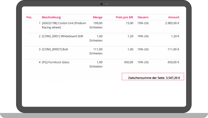 On every page except the last one where the totals are shown anyway, subtotals are shown to gain a better overview of amounts in long reports.