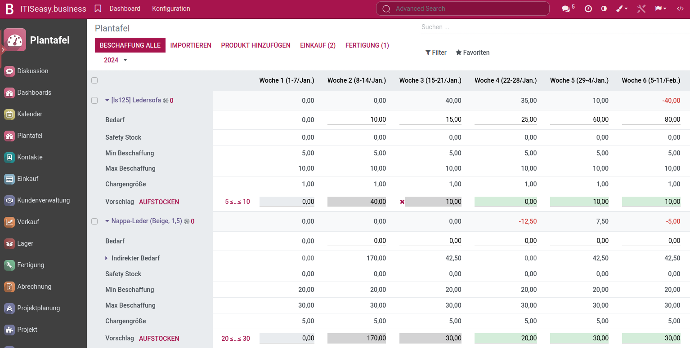 You want ERP material planning? Track product demand and stock levels in real time. The system adjusts upcoming plans automatically based on minimum stock, batch size, and safety buffers.